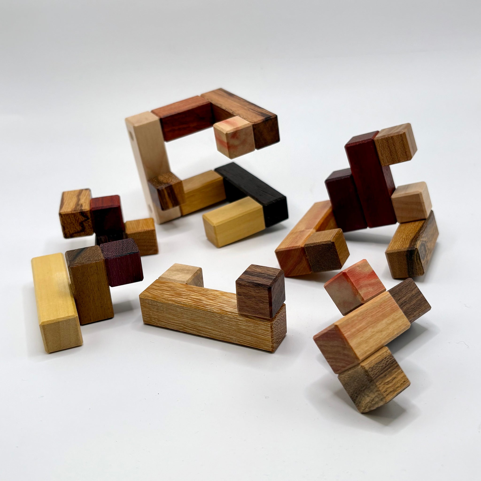 Even though ErraTIC seems to have several single moves to add the pieces, I found it to be most difficult to handle during the assembly. Lots of colorful wood species were used to build each piece from a variety of exotic and domestic woods.Over a dozen woods in each puzzle.